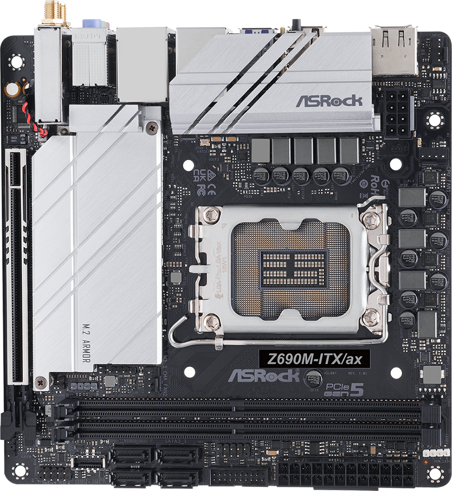 Piegāde visā Latvijā un iespēja saņemt pasūtījumu izsniegšanas punktā. Ērti norēķinu veidi. Iespēja apmaksat tieši interneta veikalā, ar karti vai skaidrā naudā preces saņemšanas punkta. Detalizēts preču apraksts un salīdzināšanas iespēja. Populārākie zīmoli no pasaules ražotājiem. 20.830,00 € Preces ID: 422493 Pamatplate ASRock Z690M-ITX/ax PamataRažotājs ........................................................................................................................................................................................................ Ražotāja kods ........................................................................................................................................................................................................ Z690M-ITX/ax Ligzda ........................................................................................................................................................................................................ LGA 1700 Mikroshēmu kopa (Chipset) ........................................................................................................................................................................................................ Intel Z690 AtmiņaAtmiņas veids ........................................................................................................................................................................................................ DDR4 Atmiņas slotu skaits ........................................................................................................................................................................................................ 2 Diska kontrolieriSATA kontrolieris ........................................................................................................................................................................................................ 4 x SATA-III (6 Gb/s) RAID atbalsts ........................................................................................................................................................................................................ 0, 1, 5, 10 Paplašināšanas slotiPaplašināšanas sloti ........................................................................................................................................................................................................ PCI-E 5.0 x16, 3 x PCI-E M.2 M.2. slotu veids ........................................................................................................................................................................................................ - Key M, 2280 (PCIe Gen4x4); - Key M, 2280 (SATA3 & PCIe Gen4x4); - Key E, supports WiFi/BT PCIe WiFi type 2230 and Intel CNVi (built-in WiFi/BT) modules. Audio/VideoIntegrētais video ........................................................................................................................................................................................................ jā (ja tiek izmantots procesors ar video kodolu) Skaņa ........................................................................................................................................................................................................ 8 kanāli (7.1) Audio kontrolieris ........................................................................................................................................................................................................ Realtek ALC897 TīklsTīkla saskarne ........................................................................................................................................................................................................ Gigabit Ethernet (10/100/1000 Mbps), 2.5 Gigabit Ethernet (100/1000/2500 Mbps), Wi-Fi, Bluetooth Tīkla kontrolieris ........................................................................................................................................................................................................ Intel I219V/Realtek RTL8125BG SaskarnesLigzdas aizmugurējā panelī ........................................................................................................................................................................................................ 2 x USB 2.0, 4 x USB 3.2 Gen2, USB 3.2 Gen2x2 Type-C, HDMI, DisplayPort, 2 x RJ-45 Barošanas apakšsistēmas radiators (mosfeti) ........................................................................................................................................................................................................ jā PapilduLigzdas korpusa ventilatoru pieslēgšanai ........................................................................................................................................................................................................ 4-pin ATX 12 V barošanas ligzda ........................................................................................................................................................................................................ 8-pin Iekšējās USB pieslēgvietas platē ........................................................................................................................................................................................................ USB 2.0, USB 3.2 Gen1, USB 3.2 Gen2x2 Type-C ARGB 5V savienotāji uz plates ........................................................................................................................................................................................................ 3-pin RGB 12V savienotāji uz plates ........................................................................................................................................................................................................ 4