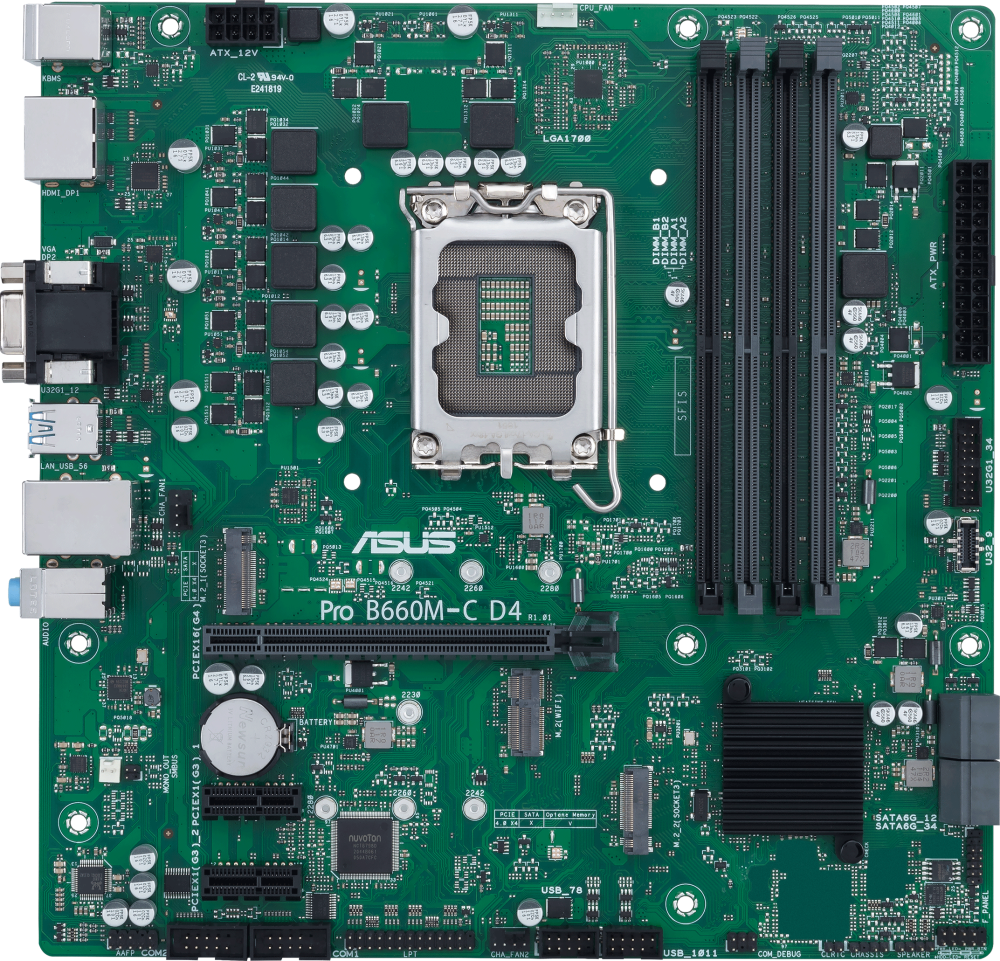 Piegāde visā Latvijā un iespēja saņemt pasūtījumu izsniegšanas punktā. Ērti norēķinu veidi. Iespēja apmaksat tieši interneta veikalā, ar karti vai skaidrā naudā preces saņemšanas punkta. Detalizēts preču apraksts un salīdzināšanas iespēja. Populārākie zīmoli no pasaules ražotājiem. 13.780,00 € Preces ID: 423333 Pamatplate ASUS PRO B660M-C D4-CSM PamataRažotājs ........................................................................................................................................................................................................ Ražotāja kods ........................................................................................................................................................................................................ PRO B660M-C D4-CSM Ligzda ........................................................................................................................................................................................................ LGA 1700 Mikroshēmu kopa (Chipset) ........................................................................................................................................................................................................ Intel B660 AtmiņaAtmiņas veids ........................................................................................................................................................................................................ DDR4 Atmiņas slotu skaits ........................................................................................................................................................................................................ 4 Diska kontrolieriSATA kontrolieris ........................................................................................................................................................................................................ 4 x SATA-III (6 Gb/s) RAID atbalsts ........................................................................................................................................................................................................ 0, 1, 5, 10 Paplašināšanas slotiPaplašināšanas sloti ........................................................................................................................................................................................................ PCI-E 4.0 x16, 2 x PCI-E x1, 2 x PCI-E M.2 M.2. slotu veids ........................................................................................................................................................................................................ - Key M, 2242/2260/2280 (PCIe 4.0 x4); - Key M, 2242/2260/2280 (PCIe 4.0 x4) Audio/VideoIntegrētais video ........................................................................................................................................................................................................ jā (ja tiek izmantots procesors ar video kodolu) Skaņa ........................................................................................................................................................................................................ 8 kanāli (7.1) Audio kontrolieris ........................................................................................................................................................................................................ Realtek ALC897 TīklsTīkla saskarne ........................................................................................................................................................................................................ Gigabit Ethernet (10/100/1000 Mbps) Tīkla kontrolieris ........................................................................................................................................................................................................ Intel SaskarnesLigzdas aizmugurējā panelī ........................................................................................................................................................................................................ 2 x PS/2, 2 x USB 2.0, 2 x USB 3.2 Gen1, VGA, HDMI, 2 x DisplayPort, RJ-45 PapilduLigzdas korpusa ventilatoru pieslēgšanai ........................................................................................................................................................................................................ 2 x 4-pin ATX 12 V barošanas ligzda ........................................................................................................................................................................................................ 8-pin Iekšējās USB pieslēgvietas platē ........................................................................................................................................................................................................ 2 x USB 2.0, USB 3.2 Gen1, USB 3.2 Gen1 Type-C Formfaktors ........................................................................................................................................................................................................ mATX Piegādes veids ........................................................................................................................................................................................................ Retail Noformējumā izmantotās krāsas ........................................................................................................................................................................................................ zaļš PapildusGarantija ..................................................................................................................................................................