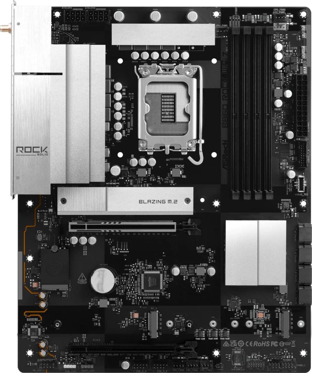 Piegāde visā Latvijā un iespēja saņemt pasūtījumu izsniegšanas punktā. Ērti norēķinu veidi. Iespēja apmaksat tieši interneta veikalā, ar karti vai skaidrā naudā preces saņemšanas punkta. Detalizēts preču apraksts un salīdzināšanas iespēja. Populārākie zīmoli no pasaules ražotājiem. Preces ID: 45545 Pamatplate ASRock B860 Rock Black (90-MXBUA0-A0UAYZ) PamataRažotājs ........................................................................................................................................................................................................ Ražotāja kods ........................................................................................................................................................................................................ 90-MXBUA0-A0UAYZ Socket ........................................................................................................................................................................................................ LGA 1851 Mikroshēmu kopa (Chipset) ........................................................................................................................................................................................................ Intel B860 AtmiņaAtmiņas veids ........................................................................................................................................................................................................ DDR5 Atmiņas slotu skaits ........................................................................................................................................................................................................ 4 Diska kontrolieriSATA kontrolieris ........................................................................................................................................................................................................ 4 x SATA-III (6 Gb/s) RAID atbalsts ........................................................................................................................................................................................................ 0, 1, 5, 10 Paplašināšanas slotiPaplašināšanas sloti ........................................................................................................................................................................................................ PCI-E 5.0 x16, PCI-E 4.0 x16, 4 x PCI-E M.2 M.2. slotu veids ........................................................................................................................................................................................................ - 1 x Blazing M.2 Socket (M2_1, Key M), supports type 2280 PCIe Gen5x4 (128 Gb/s) mode*