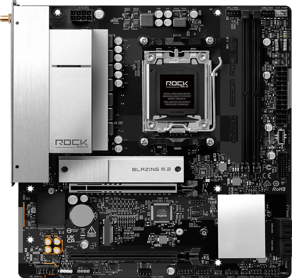 Piegāde visā Latvijā un iespēja saņemt pasūtījumu izsniegšanas punktā. Ērti norēķinu veidi. Iespēja apmaksat tieši interneta veikalā, ar karti vai skaidrā naudā preces saņemšanas punkta. Detalizēts preču apraksts un salīdzināšanas iespēja. Populārākie zīmoli no pasaules ražotājiem. Preces ID: 46228 Pamatplate ASRock B850 B850M Rock WiFi Black (90-MXBU70-A0UAYZ) PamataRažotājs ........................................................................................................................................................................................................ Ražotāja kods ........................................................................................................................................................................................................ 90-MXBU70-A0UAYZ Socket ........................................................................................................................................................................................................ AM5 Mikroshēmu kopa (Chipset) ........................................................................................................................................................................................................ AMD B850 AtmiņaAtmiņas veids ........................................................................................................................................................................................................ DDR5 Atmiņas slotu skaits ........................................................................................................................................................................................................ 2 Diska kontrolieriSATA kontrolieris ........................................................................................................................................................................................................ 4 x SATA-III (6 Gb/s) RAID atbalsts ........................................................................................................................................................................................................ 0, 1, 10 Paplašināšanas slotiPaplašināšanas sloti ........................................................................................................................................................................................................ PCI-E 5.0 x16, PCI-E 3.0 x16, 3 x PCI-E M.2 M.2. slotu veids ........................................................................................................................................................................................................ Two NVMe SSDs (one Gen5, one Gen4) and a dedicated Key E slot for the wireless card. Atbalstītie PCI-Express režīmi ........................................................................................................................................................................................................ Expansion Slots (Expansion Slots)