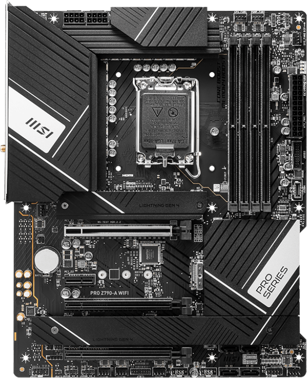 Piegāde visā Latvijā un iespēja saņemt pasūtījumu izsniegšanas punktā. Ērti norēķinu veidi. Iespēja apmaksat tieši interneta veikalā, ar karti vai skaidrā naudā preces saņemšanas punkta. Detalizēts preču apraksts un salīdzināšanas iespēja. Populārākie zīmoli no pasaules ražotājiem. Preces ID: 464375 Pamatplate MSI PRO Z790-A WIFI PamataRažotājs ........................................................................................................................................................................................................ Ražotāja kods ........................................................................................................................................................................................................ PRO Z790-A WIFI Ligzda ........................................................................................................................................................................................................ LGA 1700 Mikroshēmu kopa (Chipset) ........................................................................................................................................................................................................ Intel Z790 AtmiņaAtmiņas veids ........................................................................................................................................................................................................ DDR5 Atmiņas slotu skaits ........................................................................................................................................................................................................ 4 Diska kontrolieriSATA kontrolieris ........................................................................................................................................................................................................ 6 x SATA-III (6 Gb/s) RAID atbalsts ........................................................................................................................................................................................................ 0, 1, 5, 10 Paplašināšanas slotiPaplašināšanas sloti ........................................................................................................................................................................................................ PCI-E 5.0 x16, PCI-E 4.0 x16, PCI-E 3.0 x16, PCI-E x1, 4 x PCI-E M.2 M.2. slotu veids ........................................................................................................................................................................................................ - Key M, 22110/2280/2260/2242 (PCIe 4.0 x4); - Key M, 2280/2260/2242 (PCIe 4.0 x4); - Key M, 2280/2260/2242 (PCIe 4.0 x4 & SATA); - Key M, 2280/2260/2242 (PCIe 4.0 x4 & SATA). Atbalstītie PCI-Express režīmi ........................................................................................................................................................................................................ x16/x4/x1 Audio/VideoIntegrētais video ........................................................................................................................................................................................................ jā (ja tiek izmantots procesors ar video kodolu) Skaņa ........................................................................................................................................................................................................ 8 kanāli (7.1) Audio kontrolieris ........................................................................................................................................................................................................ Realtek ALC4080 TīklsTīkla saskarne ........................................................................................................................................................................................................ 2.5 Gigabit Ethernet (100/1000/2500 Mbps), Wi-Fi, Bluetooth Tīkla kontrolieris ........................................................................................................................................................................................................ Intel SaskarnesLigzdas aizmugurējā panelī ........................................................................................................................................................................................................ 2 x USB 2.0, 2 x USB 3.2 Gen1, 3 x USB 3.2 Gen2, USB 3.2 Gen2x2 Type-C, HDMI, DisplayPort, RJ-45, S/PDIF (optiskais) Barošanas apakšsistēmas radiators (mosfeti) ........................................................................................................................................................................................................ jā PapilduLigzdas korpusa ventilatoru pieslēgšanai ........................................................................................................................................................................................................ 6 x 4-pin ATX 12 V barošanas ligzda ........................................................................................................................................................................................................ 2 x 8-pin Iekšējās USB pieslēgvietas platē ........................................................................................................................................................................................................ 2 x USB 2.0, USB 3.2 Gen1, USB 3.2 Gen2 Type-C ARGB 5V savienotāji uz plates .................................................................................................................................................................